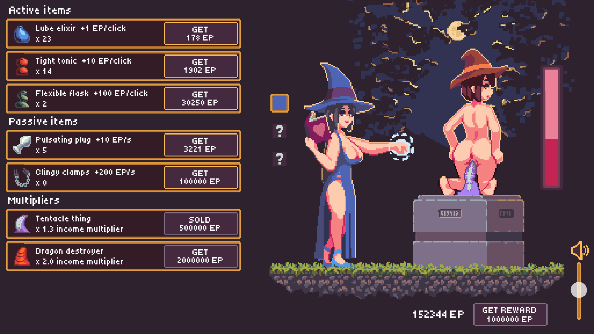 The game is okay, but i was thinking some improvements, after the main witch is naked she and her apprentice will do lesbian sex.